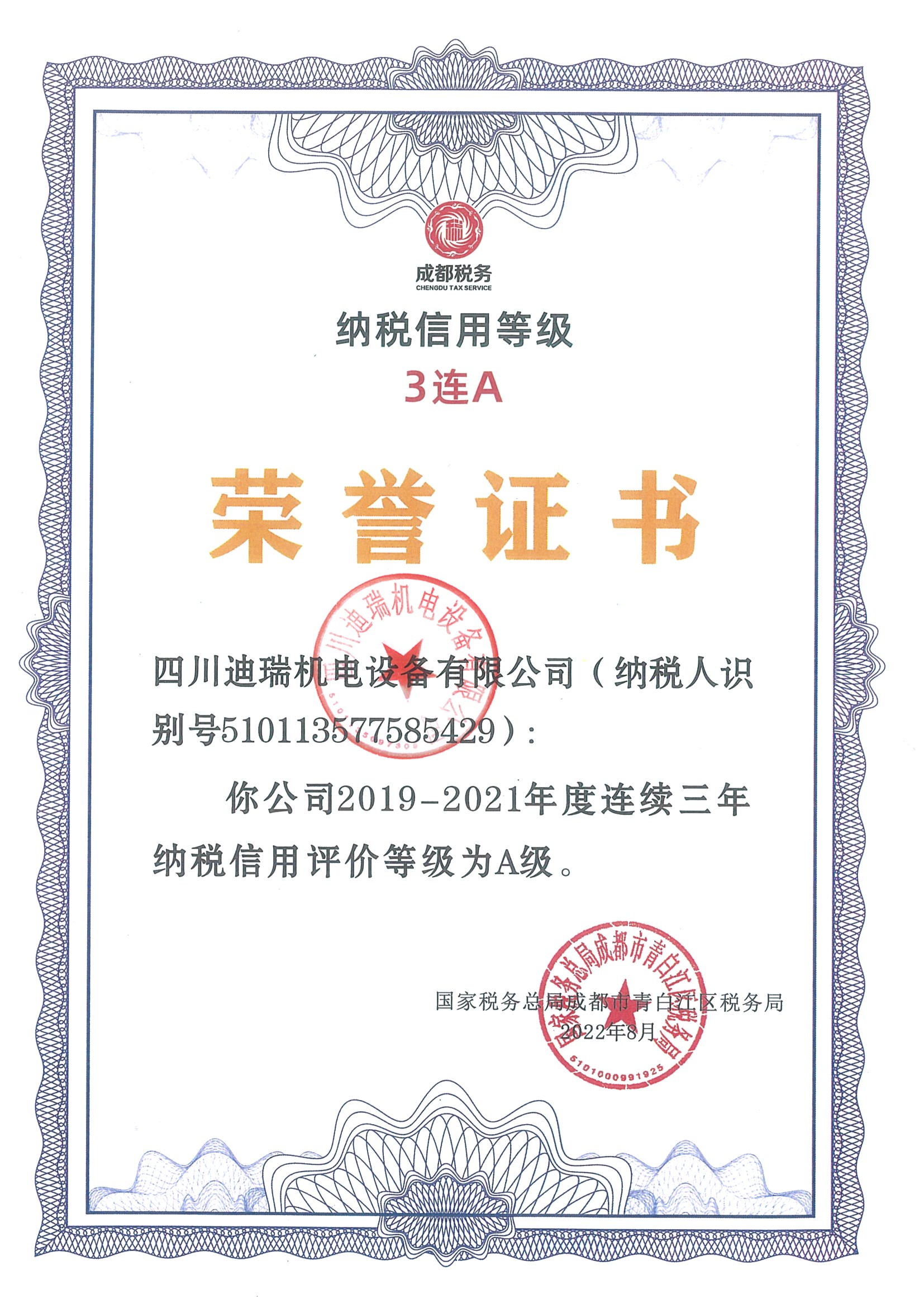納稅3A等級(jí)證書(shū)